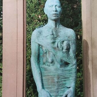 Die Freiplastik ""Über die Schwelle"" wurde 1988 vom Bildhauer Martin Kirstein aus Winnenden gefertigt. Das kreisrunde niedrige Becken aus Buntsandstein mit rechteckigem Aufbau besitzt ein schmales Portal mit Gewände als Laibung darstellend. Vor der Portalöffnung steht eine Bronzefigur, die mit Leinenbinden eingehüllt ist, im Brustbereich sind drei Figuren angedeutet. An der rechten Schulter ist eine Hand zu sehen. Das Kunstwerk symbolisiert den Mensch an der Schwelle des Todes, am Grenzfluss. Es ist 325cm hoch, 102cm breit und das Becken hat einen Durchmesser von 360cm. Sehr gut erhalten.