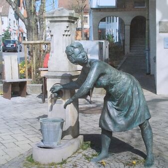 Der „Taubenbrunnen“ stammt ursprünglich aus dem Jahr 1866, wurde aber 1968 wegen Straßenarbeiten abgerissen und 1991 neu gesetzt, wobei die ehemals 3,80mhohe Brunnensäule aus Gusseisen mit den vier Ausgüssen und der verzierten Vase als Abschluss der Säule wiederverwendet wurde. Statt eines achteckigen Brunnenbeckens befinden sich dort nun unterschiedlich hohe halbrunde Becken aus Stein, darauf drei Tauben und eine Katze aus Bronze und davor die Bronzefigur eines trinkenden Ziegenbocks. Der Brunnen wurde vom Bildhauer Martin Kirstein aus Winnenden.