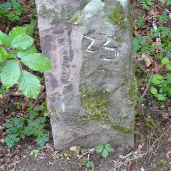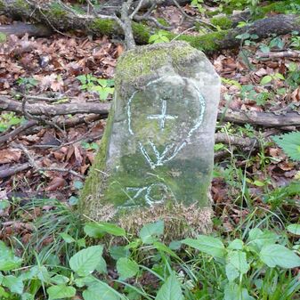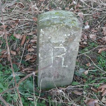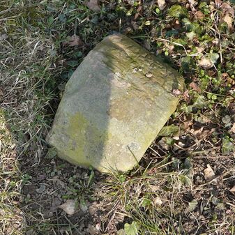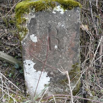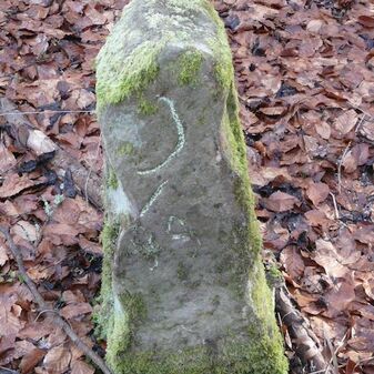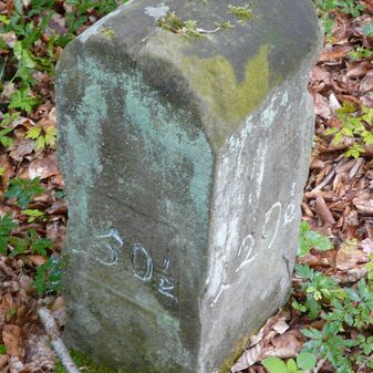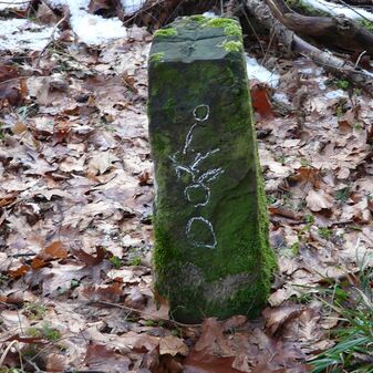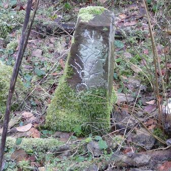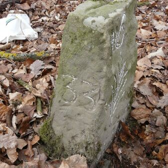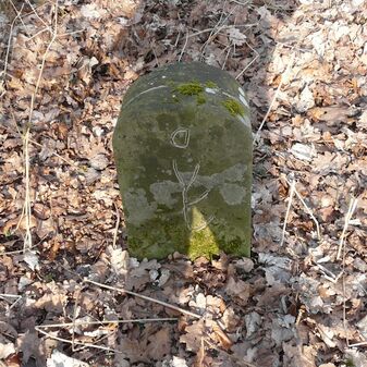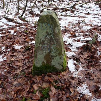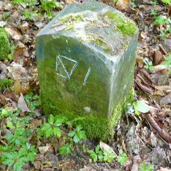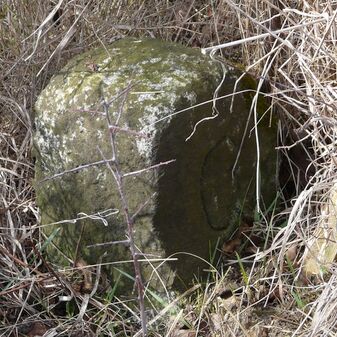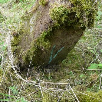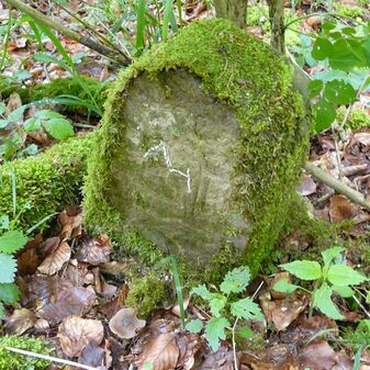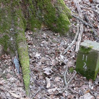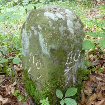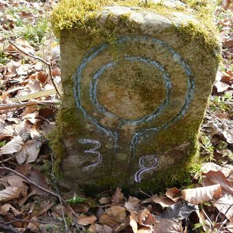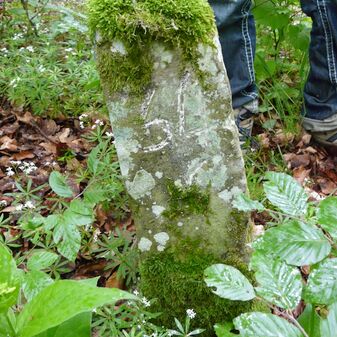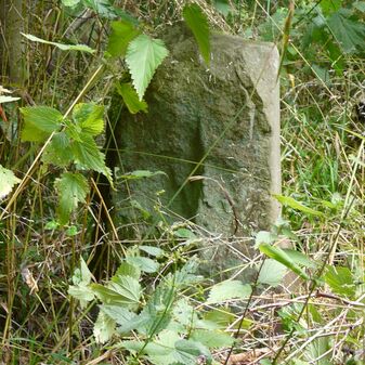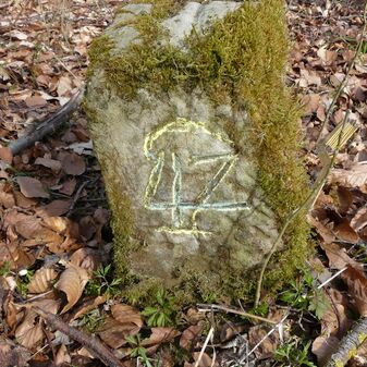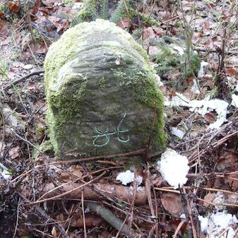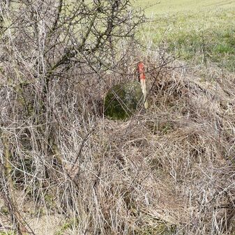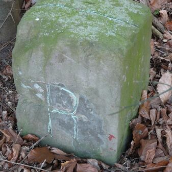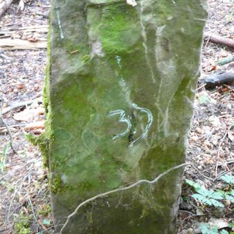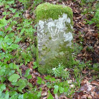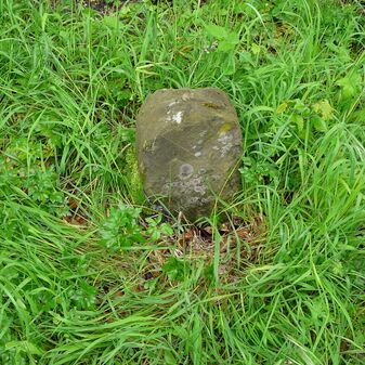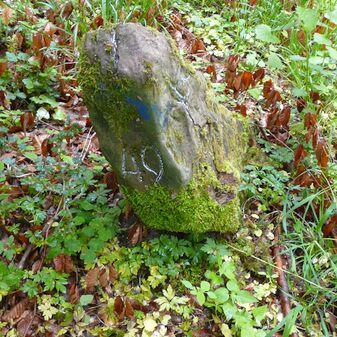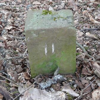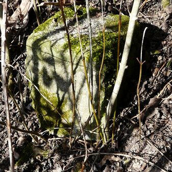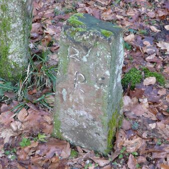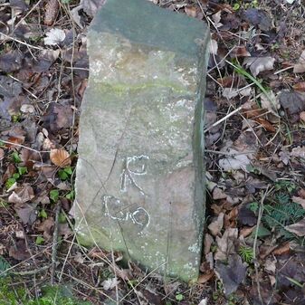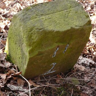 Gemarkungsgrenzstein auf aktuellem Grenzverlauf Rutesheim / Perouse, beide Gemeinde Rutesheim; Sandstein, rechteckige Grundform, flacher Kopf; befriedigend erhalten; 35cm hoch, 28cm breit und 25cm tief.