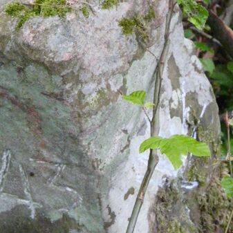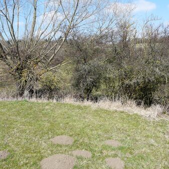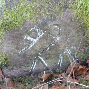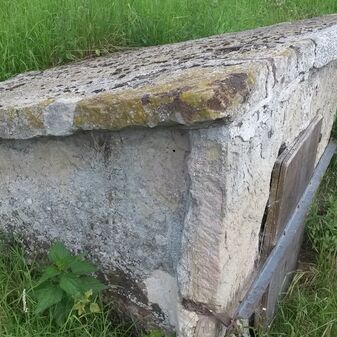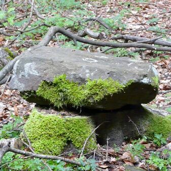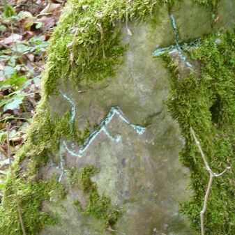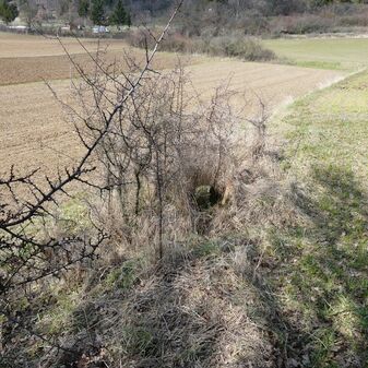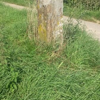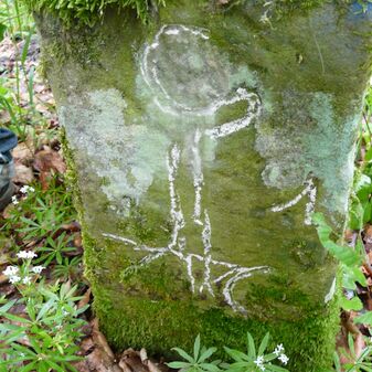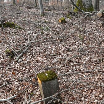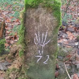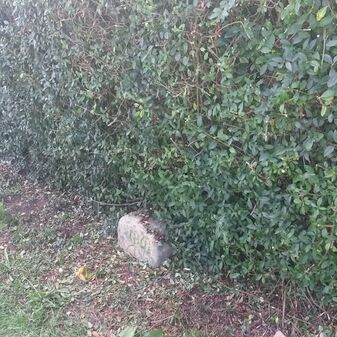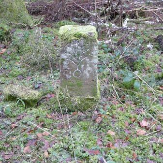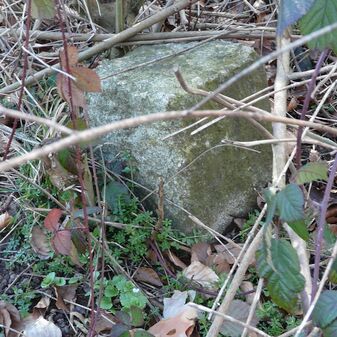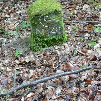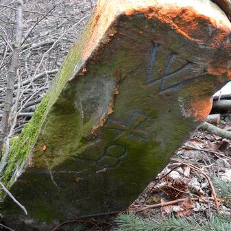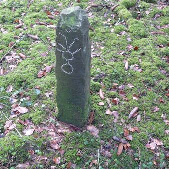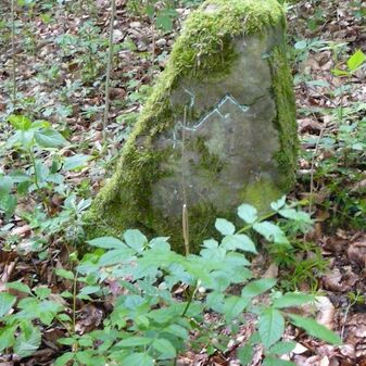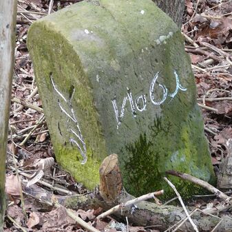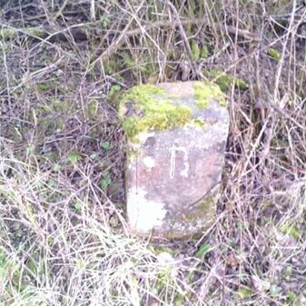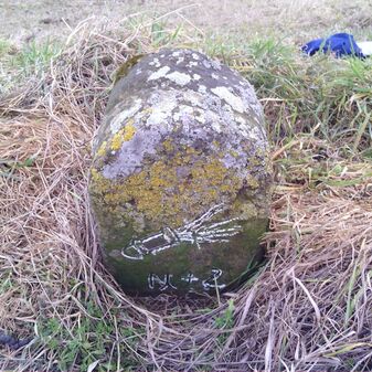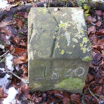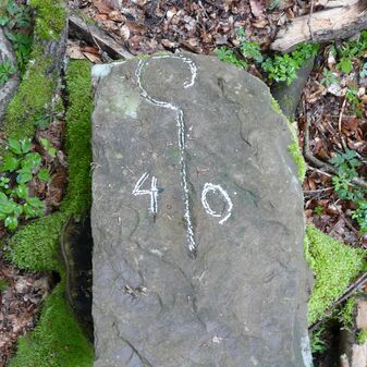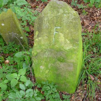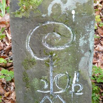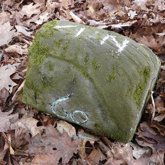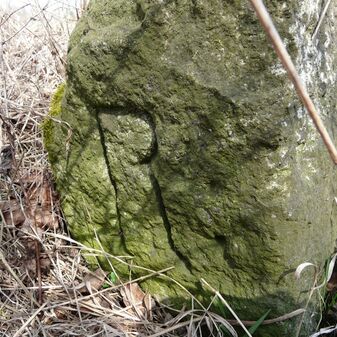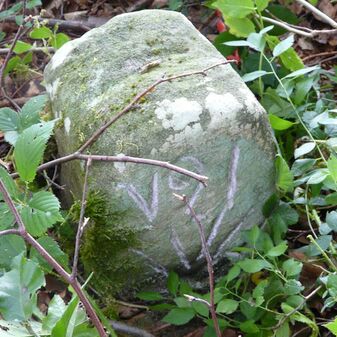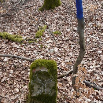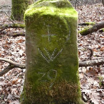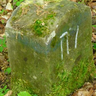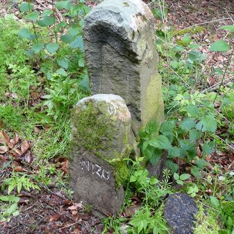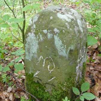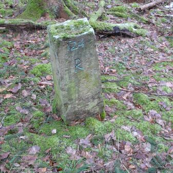 Gemarkungsgrenzstein auf aktuellem Grenzverlauf Rutesheim / Perouse, beide Gemeinde Rutesheim; Sandstein, rechteckige Grundform, flacher Kopf; befriedigend erhalten; 35cm hoch, 28cm breit und 25cm tief.