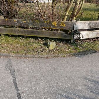 Gedenkstein für Straßenbau von 1933. Dreieckige Grundform, Sandstein, Inschrift. Befriedigend erhalten.
