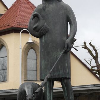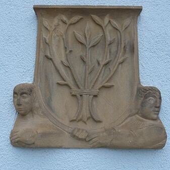 Der Stein mit dem Stadtwappen und zwei Büsten sind an der Südseite des Alten Rathauses in die Fassade eingelassen. Der Stein wurde wohl zwischen 1950 und 1960 von Bildhauer Albert Volz geschaffen. Er ist sehr gut erhalten und 80cm hoch wie breit.
