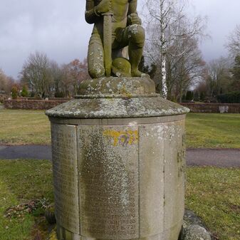 Das Denkmal von 1924 erinnert an die Gefallenen und Vermissten des Ersten Weltkriegs. Es besteht aus einem Sockel mit Inschriften und darauf der steinernen Figur eines knienden Soldaten mit Schwert. Das Denkmal wurde von Künstler Rudolf Stocker geschaffen, ist gut erhalten, 3m hoch und hat einen Durchmesser von 140cm.