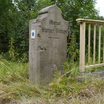 Grenzstein an der Gemarkungsgrenze der ehemaligen Oberämter Stuttgart und Böblingen. Rechteckige Grundform, Sandstein, spitzer Abschluss, Inschrift. Gut erhalten, 135cm hoch, 60cm breit, 30cm tief.
