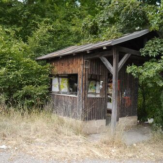 Unterstand „Schützenhäusle", der früher den Feldschützen als Schutzhütte diente. Fachwerk-Häuschen mit Brettern an der Außenseite, Holz, Blechdach, große Öffnung und Vordach. Befriedigend erhalten, 3,40m hoch, 3m breit, 4mtief.