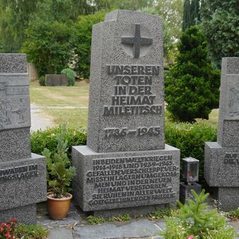 Dreiteilige Gedenkstätte für die Toten der donauschwäbischen Gemeinde Miletitsch im serbischen Banat, gefertigt 1973 von Steinmetz Ewald Beck aus Schönaich für die zwischen 1735 und 1945 Verstorbenen der alten Heimat.