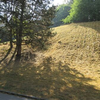 Ehemaliger Eingang zum Luftschutzbunker „Herrenwäldle“, mit drei Gängen und zwei Eingängen. Zum Schutz gegen Luftangriffe im Zweiten Weltkrieg für ca. 1000 Personen angelegt. Die Eingänge sind nur noch als leichte Senken im Wiesenhang erkennbar.