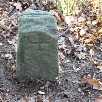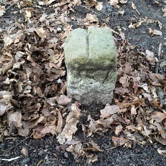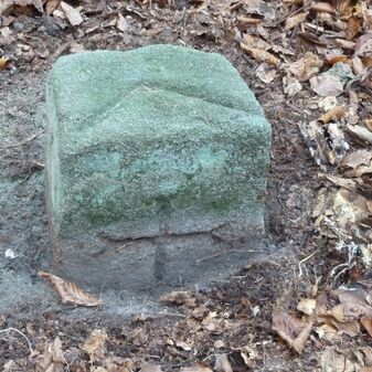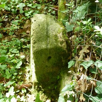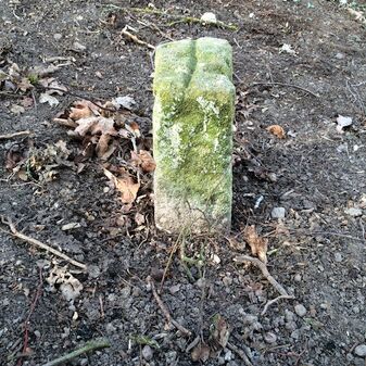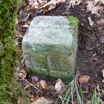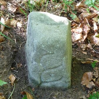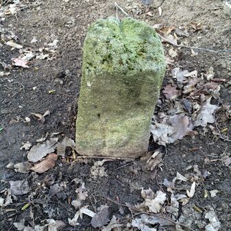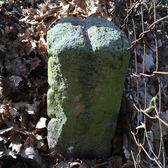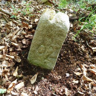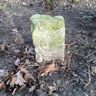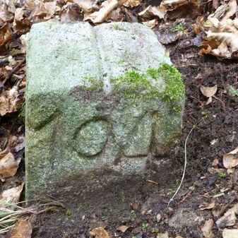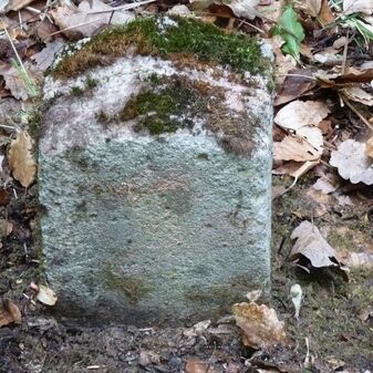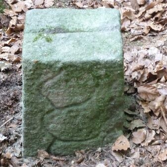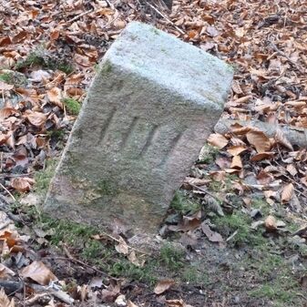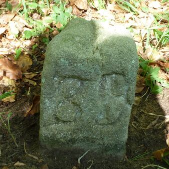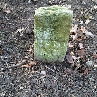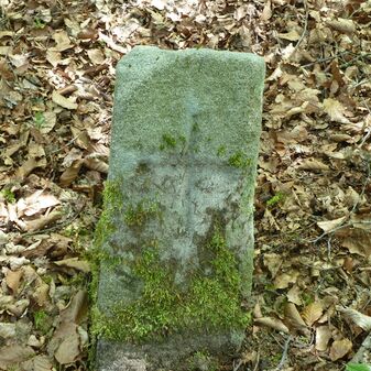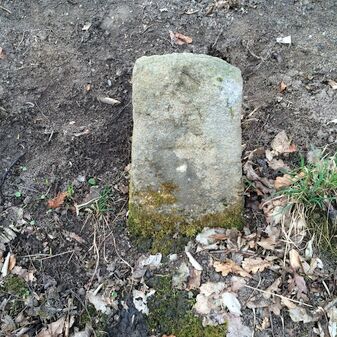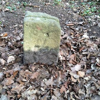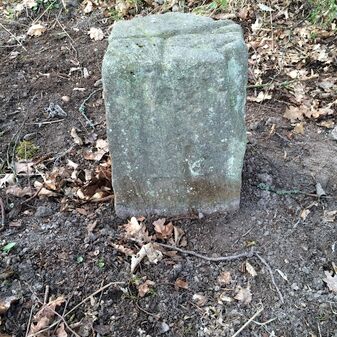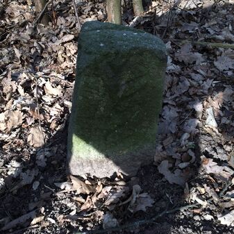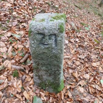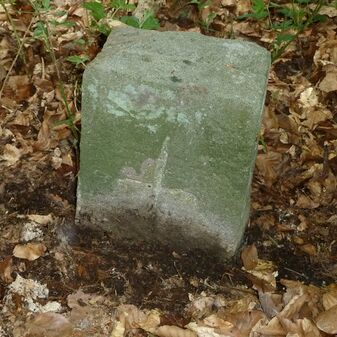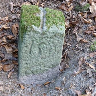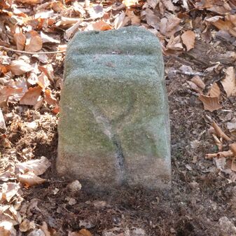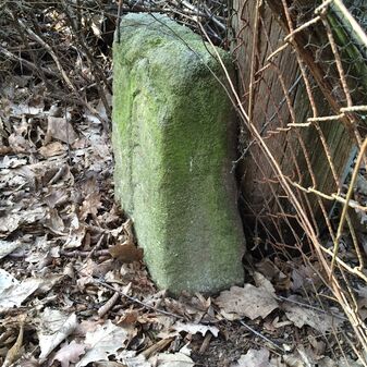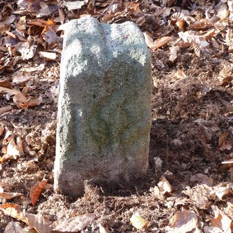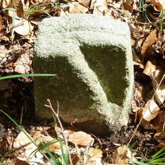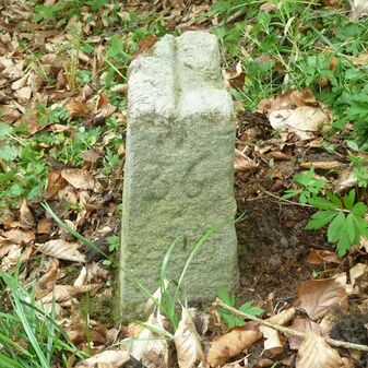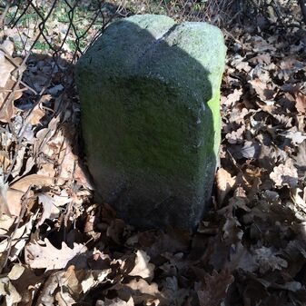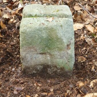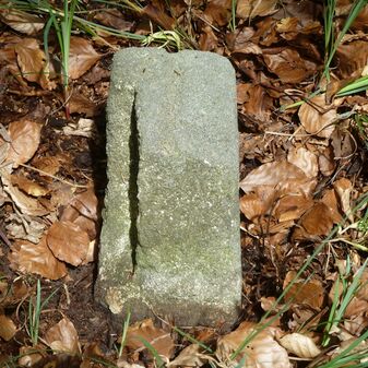 Grenzstein aus Sandstein, errichtet 1910. Mit Inschrift. Rechteckige Grundform und gewölbter Kopf. Verziert. Gut erhalten, 150cm hoch, 60cm breit und tief. An diesen Standort versetzt.