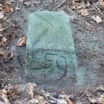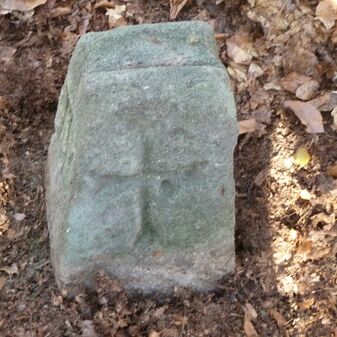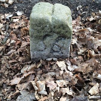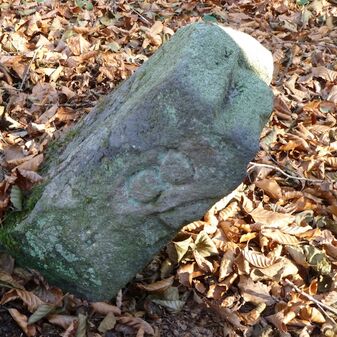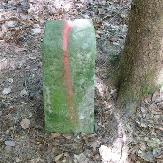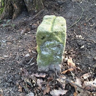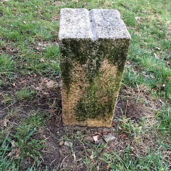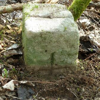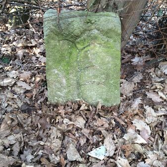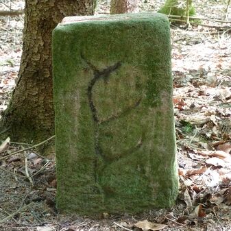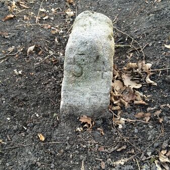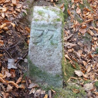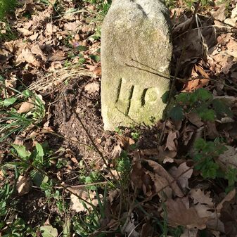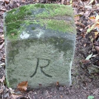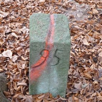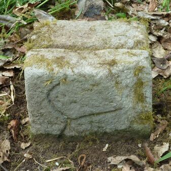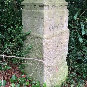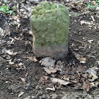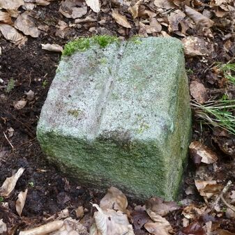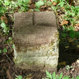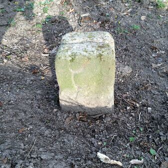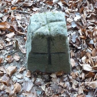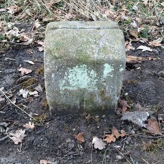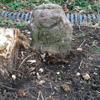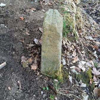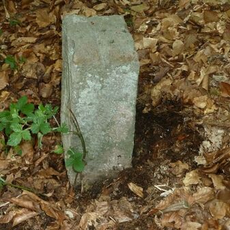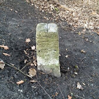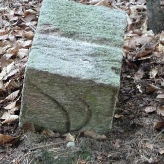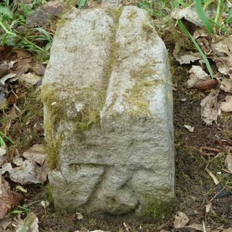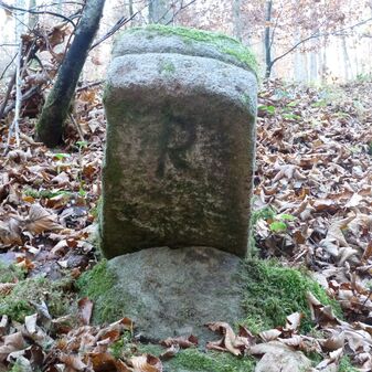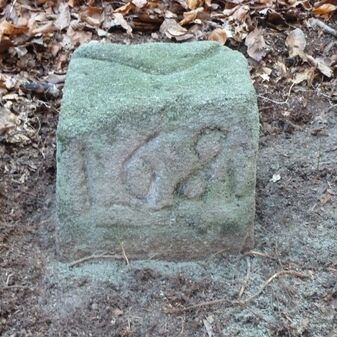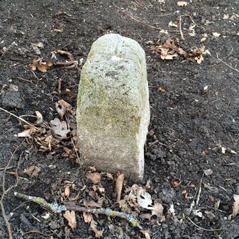 Grenzstein aus Sandstein, errichtet 1910. Mit Inschrift. Rechteckige Grundform und gewölbter Kopf. Verziert. Gut erhalten, 150cm hoch, 60cm breit und tief. An diesen Standort versetzt.