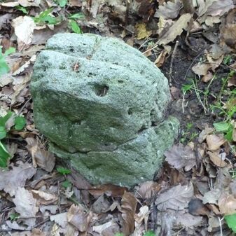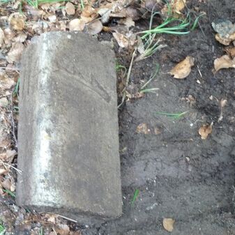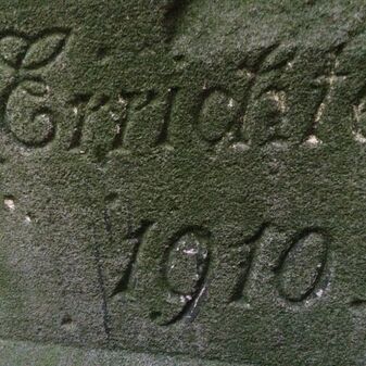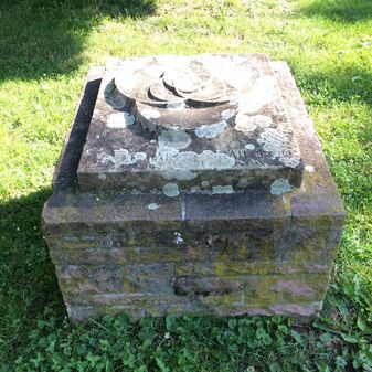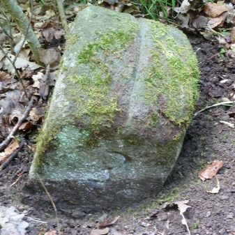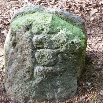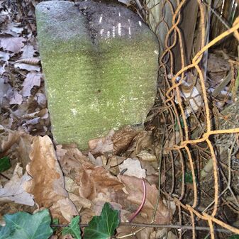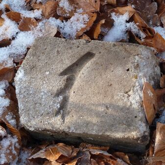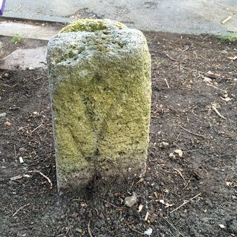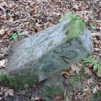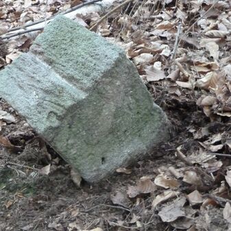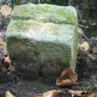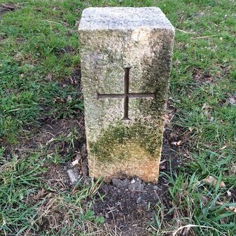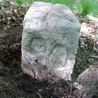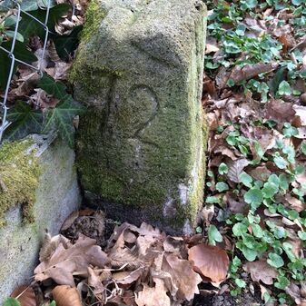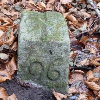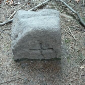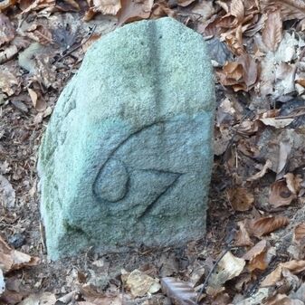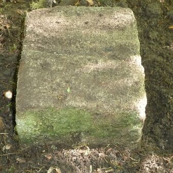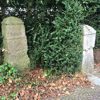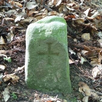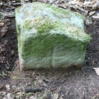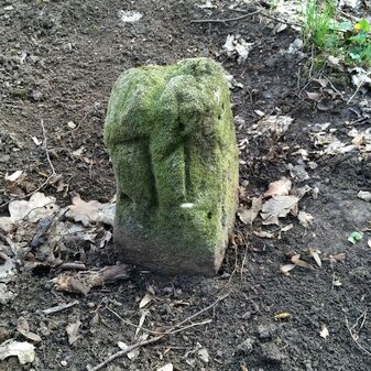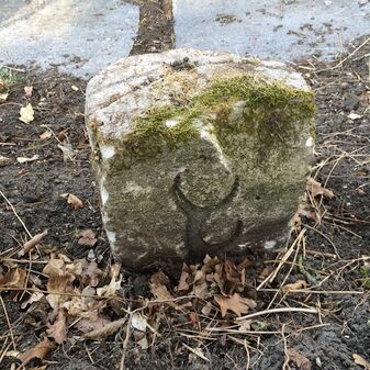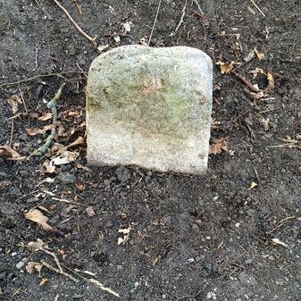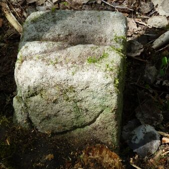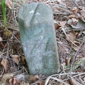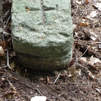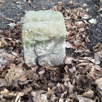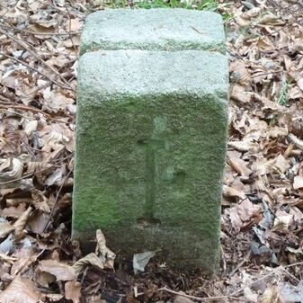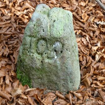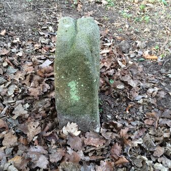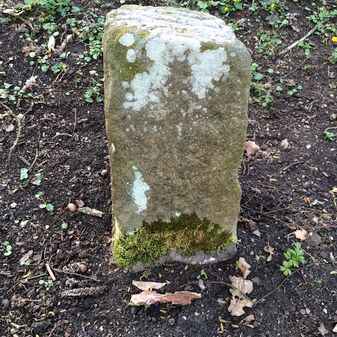 Grenzstein aus Sandstein, errichtet 1910. Mit Inschrift. Rechteckige Grundform und gewölbter Kopf. Verziert. Gut erhalten, 150cm hoch, 60cm breit und tief. An diesen Standort versetzt.