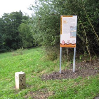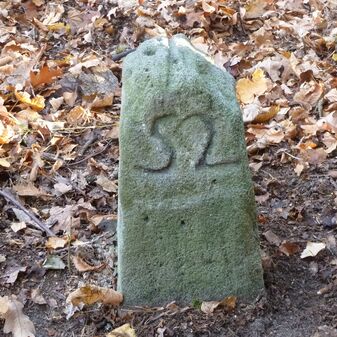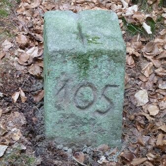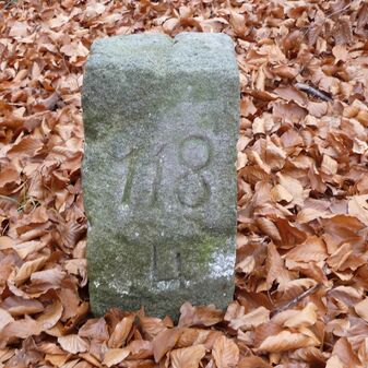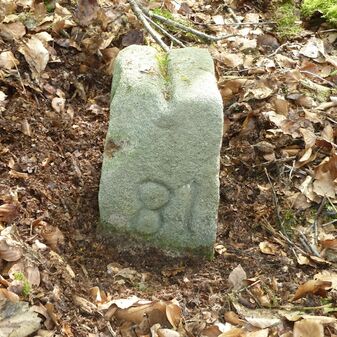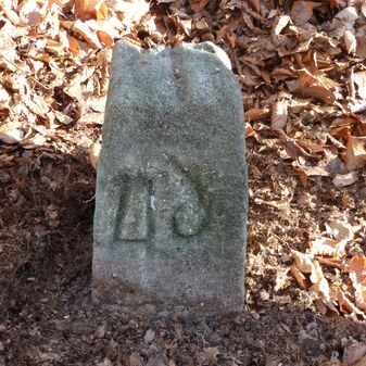 Grenzstein aus Sandstein, errichtet 1910. Mit Inschrift. Rechteckige Grundform und gewölbter Kopf. Verziert. Gut erhalten, 165cm hoch, 57cm breit und tief. An diesen Standort versetzt.