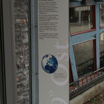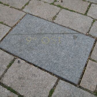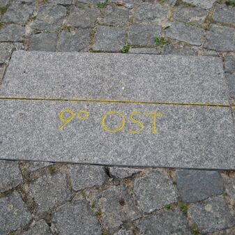Fünf Granitbodenplatten von 2013 an verschiedenen Stellen der Innenstadt, mit Inschrift und Meridianlinie (Nordrichtung). Sie sollen den Lauf des 9. östlichen Längengrades durch Sindelfingen sichtbar machen. Zwei Stelen mit Erläuterungen. Sehr gut erhalten. Bodenplatten: 35cm breit, 60cm lang; Stelen: 220cm hoch, 35cm breit und 1cm tief