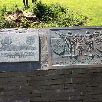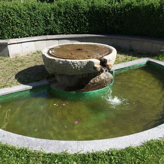 Brunnen und Steinsockel mit zwei Reliefplatten. Die beiden Reliefplatten wurden anlässlich des 25-jährigen bzw. 50-jährigen Jubiläums der Städtepartnerschaft mit Sondrio (Italien) 1987 und 2012 gefertigt. Die Brunnenschale besteht aus einem ehemaligen Torkel (Weinpresse) aus Sondri, das Wasser läuft über einen Auslauf in ein halbkreisförmiges Brunnenbecken. Maße Torkelschale: 0,46m hoch, Durchmesser ca. 1,45m. Maße Brunnenbecken: Durchmesser ca. 4m. Gut erhalten.