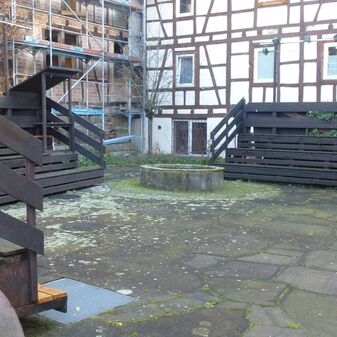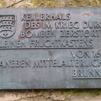 KELLERHALS / DES IM KRIEG DURCH / BOMBEN ZERSTÖRTEN / KLEINEN FRUCHTKASTENS / VON 1605. / DANEBEN MITTELALTERLICHER / BRUNNEN. / […]