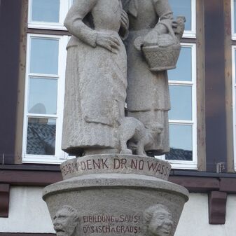Freiplastik „Brunnenszene“. Dargestellt sind knapp lebensgroß eine junge Frau mit Krug und eine kleiner Junge, die sich unterhalten. Geschaffen 2007 vom Künstler Martin Kirstein und gestiftet von Alwine Weller geb. Schwab, deren Elternhaus früher neben dem Salzhaus stand. Gut erhalten, 160cm hoch, 120cm breit und 50cm tief.
