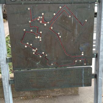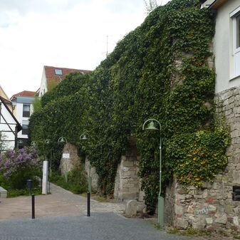Stadtmauerreste an verschiedenen Stellen der Innenstadt; Metallplatte mit Stadtwappen und Inschrift.