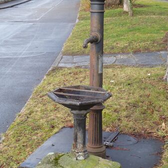 Pumpbrunnen, bestehend aus einem gusseisernen Brunnenstock mit Verzierungen und einem Brunnenbecken. Ohne Schwengel. Mit Inschrift. Errichtet vermutlich 1978 als Jubiläumsgeschenk der TWS (Technische Werke Stuttgart). 200cm hoch, 35cm breit und 35cm tief. Mangelhaft erhalten.