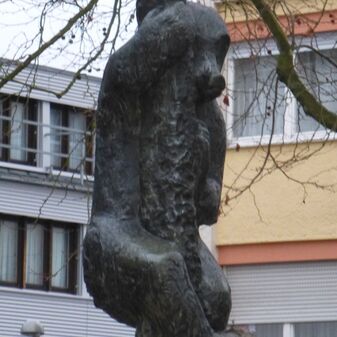 Laufbrunnen mit zwei Becken aus Flyschgestein und eine Skulptur aus Bronze, die zwei an einem Baum emporkletternde Bärenjunge darstellt. Maße der Skulptur: 6m hoch und 2m breit. Sehr gut erhalten