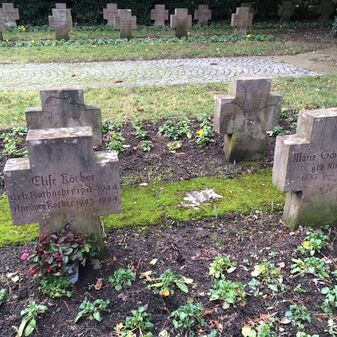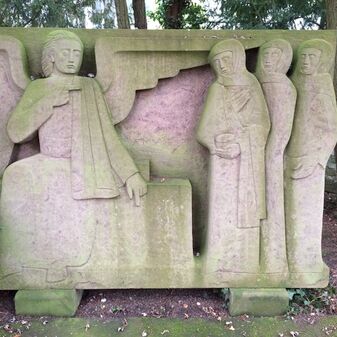 Gefallenendenkmal für die Gefallenen, Vermissten und Opfer des Zweiten Weltkriegs. Die Gesamtanlage umfasst 71 Ehrengräber, 17 Sandsteinstelen sowie das Mahnmal „Ostermorgen“. Die Ehrengräber mit Sandsteinkreuzen sind in sechs Reihen angeordnet und geben die einzelnen Namen und Lebensdaten wieder. Die Sandsteinstelen geben in alphabetischer Reihenfolge die Namen der Toten und Vermissten der Jahre 1939 - 1952 an. Das Mahnmal „Ostermorgen“ wurde vom Künstler Helmut Uhrig geschaffen und stellt den Engel und die drei Frauen am leeren Grab Christi dar. Gut erhalten. Maße der Sandsteinkreuze: 60cm hoch, 45cm breit, 12cm tief. Maße der Stelen: 160cm hoch, 45cm breit, 19cm tief. Maße des Mahnmals: 190cm hoch, 250cm brei, 45cm tief.
