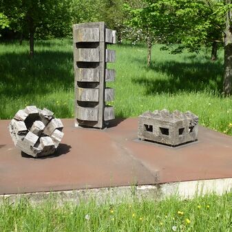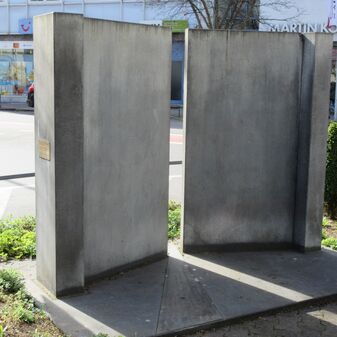 Gedenkstätte für die Zwangsarbeiter des Zweiten Weltkriegs und die NS-Opfer, bestehend aus zwei Sandsteintafeln mit Inschriften und einer Bodenplatte mit einem Lorbeerzweig aus Metall mit Inschrift. Die rechte Tafel wurde 1983 vom Künstler Jörg Failmezger aus Maulbronner Sandstein geschaffen. Sehr gut erhalten. Maße der linken Tafel: 160cm hoch, 45cm breit, 19cm tief. Maße der rechten Tafel: 160cm hoch, 120cm breit und 20cm tief. Maße der Bodenplatte: 45cm breit und 70cm tief.