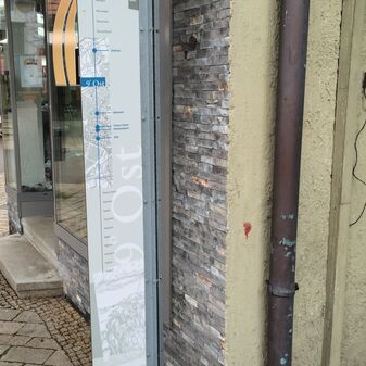 Gedenktafel aus Marmor für die Opfer der NS-Gewaltherrschaft, angebracht neben dem Haupteingang zum Rathaus. Die Inschrift nennt die Namen der Opfer und mahnt zum Gedenken. Sehr gut erhalten, 180cm hoch, 185cm breit, 6cm tief.