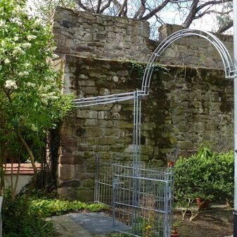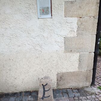 RESTSTÜCK DER / STADTMAUER / AUS DEM 13. JAHRHUNDERT. / BIS ZUR ZERSTÖRUNG DURCH / BOMBEN IM ZWEITEN WELTKRIEG / STANDEN HIER AM OBEREN TOR / DIE ZEHNTSCHEUER UND EINIGE / BÜRGERHÄUSER