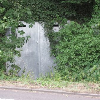 Gedenkstätte zur Erinnerung an fünf Opfer des Luftangriffs vom 10.09.1944, die in einem betonierten Deckungsgraben starben; bestehend aus Beton mit einem Glasfenster, hinter dem drei Treppenstufen hinabführen. Auf den Treppenstufen sind die Lebensdaten der Verstorbenen angegeben. Neu gesetzt 2009. 234cm hoch, 126cm breit, 40cm tief. Sehr gut erhalten.