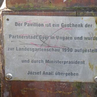 Der Pavillion ist ein Geschenk der / Partnerstadt Györ in Ungarn und wurde / zur Landesgartenschau 1990 aufgestellt / und durch Ministerpräsident / Jozsef Anall übergeben / PARTNER / UND FREUNDE / SINDELFINGEN / IN EUROPA […]