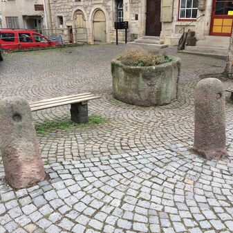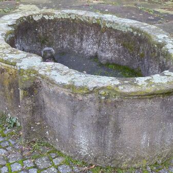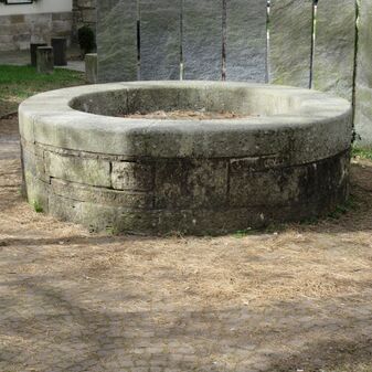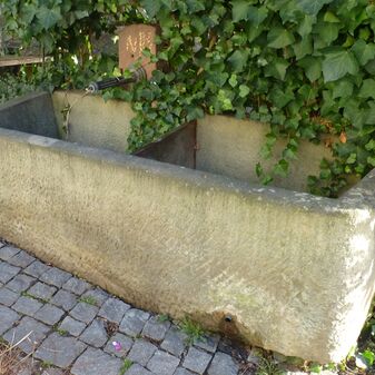 Brunnentrog aus Sandstein mit Inschrift, davor zwei Prellsteine. Geschaffen vermutlich 1777. Nicht mehr funktionsfähig und bepflanzt. Befriedigend erhalten. 80cm hoch, Durchmesser 140cm