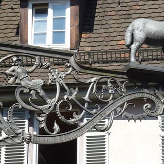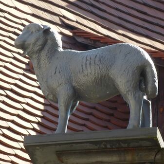 Ausleger des ehemaligen Gasthauses "Lamm. Aus Metall. Dargestellt ist ein Lamm, das auf einem Gitterträger steht. Im Gitterträger ist ein fröhlicher Zecher mit einem Trinkglas in der linken Hand und einer Flasche in der rechten Hand abgebildet. Gut erhalten. Ca. 140cm hoch, 180cm breit, 30cm tief.