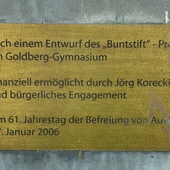 Nach einem Entwurf des „Buntstift“-Projekts / am Goldberg-Gymnasium / Finanziell ermöglicht durch Jörg Korecki / und bürgerliches Engagement / Am 61. Jahrestag der Befreiung von Auschwitz / 27. Januar 2006