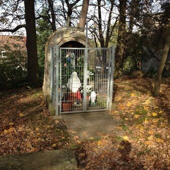 Grotte der „Madonna Santa Maria de Lourdes“, bestehend aus Stein mit Skulpturen der Madonna und einer betenden Frau mit Schafen. Mit Inschrift im Keilstein und Gitter vor der Grotte zum Schutz der Madonna vor Diebstahl und Beschädigungen. Erbaut nach der Ankunft italienischer Gastarbeiter in Sindelfingen. Gut erhalten.