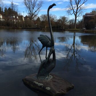 Freiplastik „Flamingo und Pelikan“. Dargestellt sind ein Flamingo und ein Pelikan. Geschaffen 1956 vom Künstler Erich Glauer. Der ursprüngliche Standort war der Brunnen am Planiedreieck, bis 1982 im Zuge der Umgestaltung des Marktplatzes eine Umsetzung notwendig wurde. Als neuer Standort wurde das südliche Ufer des Klostersees gewählt. Gut erhalten, 220cm hoch, 60cm breit und tief.