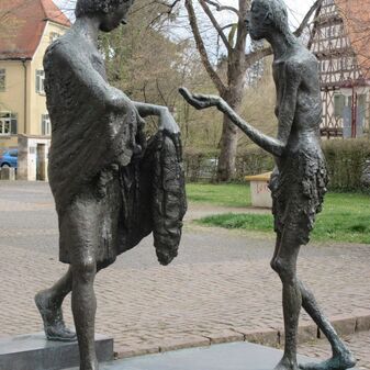 Bronzestatue des Heiligen Martin mit Bettler.Dargestellt ist die Mantelteilung. Entwurf von Fritz Nuss, Künstler aus Strümpfelbach. Hergestellt von der Kunstgießerei Ernst Strassacker aus Süßen anlässlich des 900-jährigen Bestehens der Sindelfinger Martinskirche 1983. 205cm hoch, 180cm breit und 160cm tief. Sehr gut erhalten.