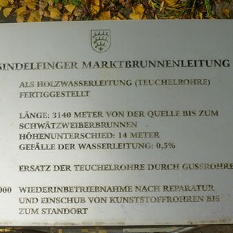 Hinweisschilder „Stadtgeschichtlicher Weg“, geschaffen 1979, bestehend aus Bronzeplatten mit Inschriften auf Steinpodesten. Die Schilder begleiten mit hilfreichen Informationen den Weg, der u.a. durch die historische Altstadt von Sindelfingen führt. Die Texte stammen von Eugen Schempp, Oberregierungsvermessungsdirektor und ehemaliger ehrenamtlicher Leiter des Stadtmuseums. Die Bronzetafeln wurden von Herbert Gebauer, Bildhauer aus Stuttgart, hergestellt. Sehr gut erhalten.