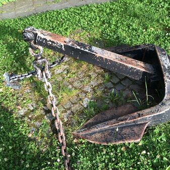 Anker aus Metall mit Inschrift. Gut erhalten, 70cm hoch, 120cm breit und130cm tief.