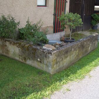 Pumpbrunnen mit gusseisernem Brunnenstock mit Schwengel und rechteckigem Betontrog. Schutzanstrich ursprünglich rot, heute verblichen. Befriedigend erhalten, 170cm hoch, 116cm breit und 44cm tief.