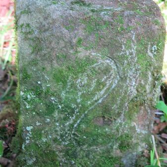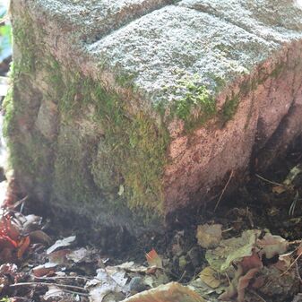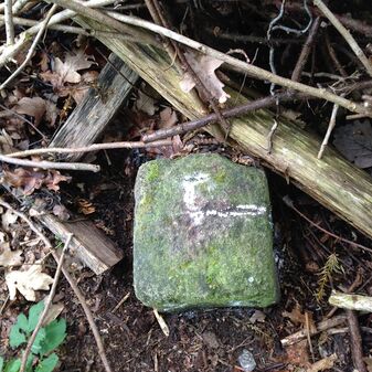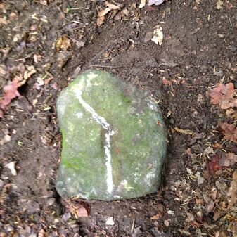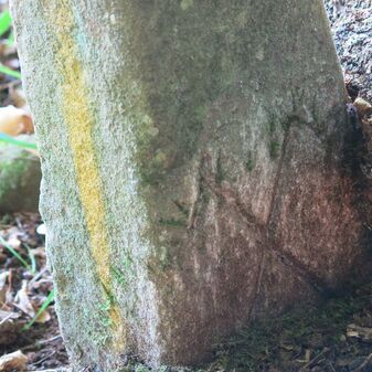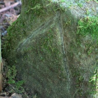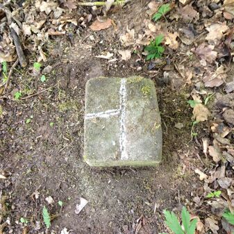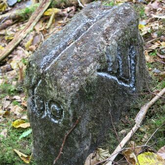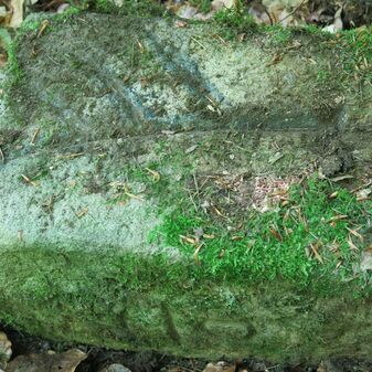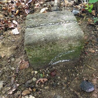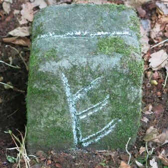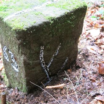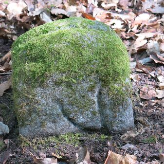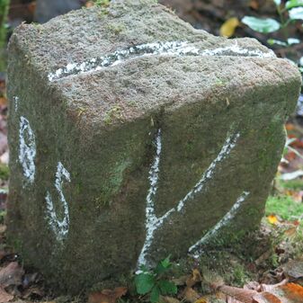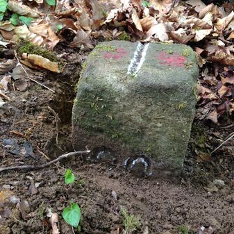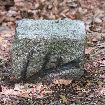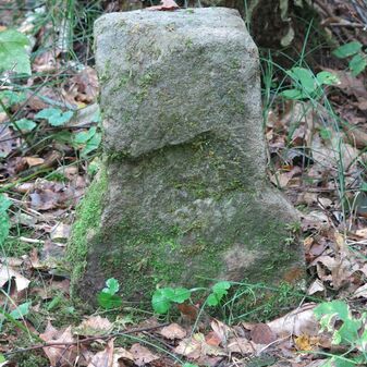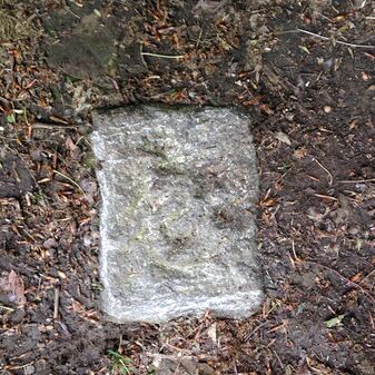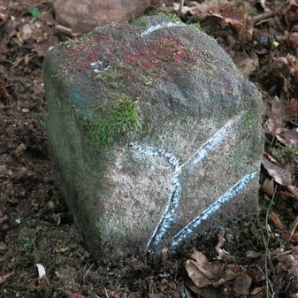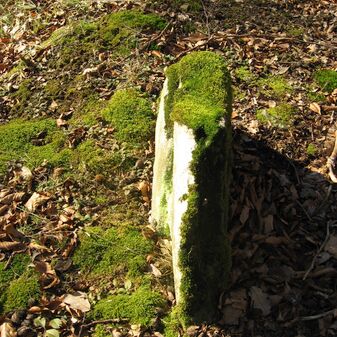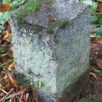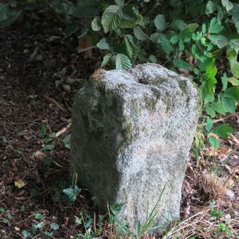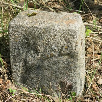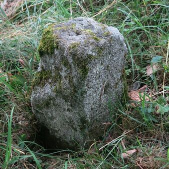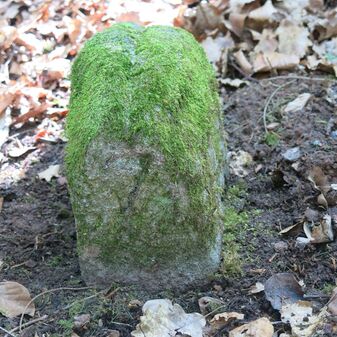 Grenzstein auf Gemarkung Steinenbronn; Dreimärker; Sandstein, rechteckige Grundform, flacher Kopf mit T-förmiger Krinne; gut erhalten, 10cm hoch, 25cm breit und 20cm tief.