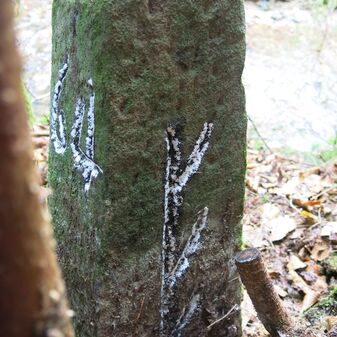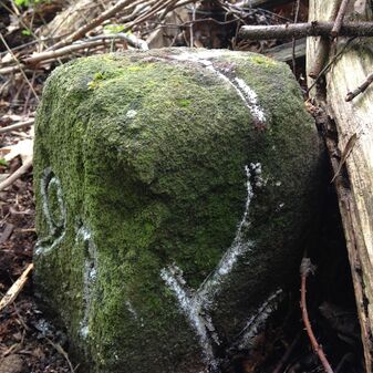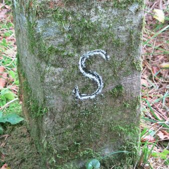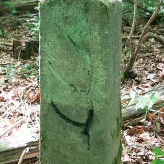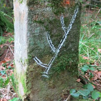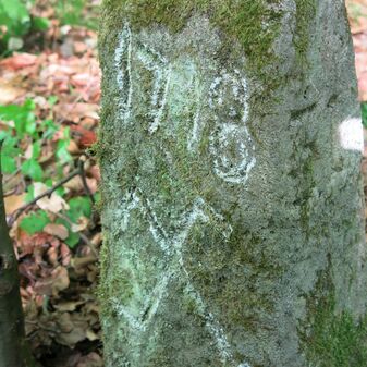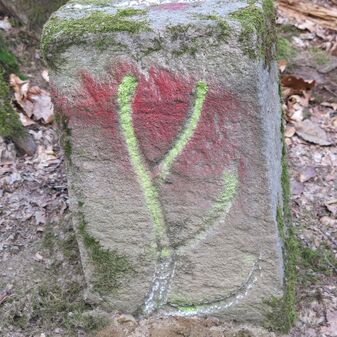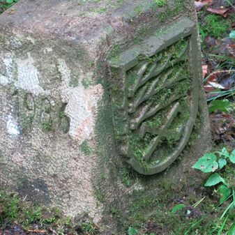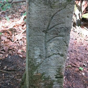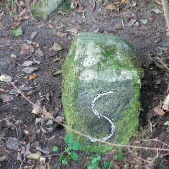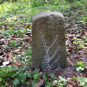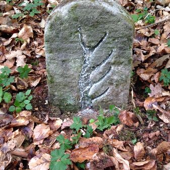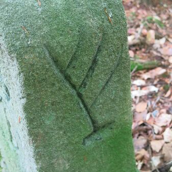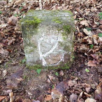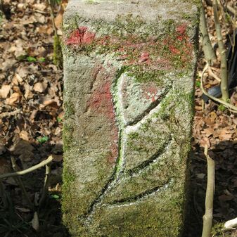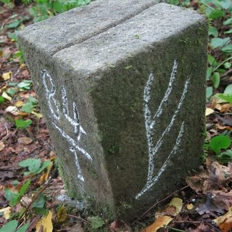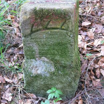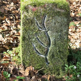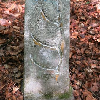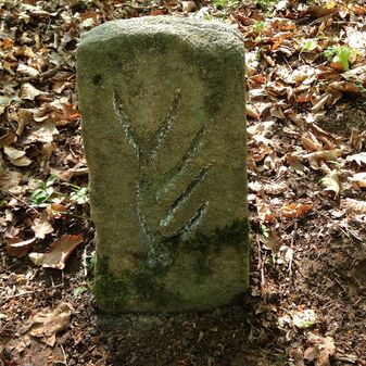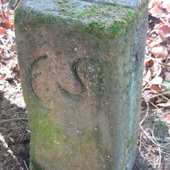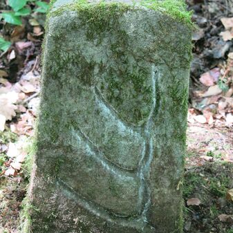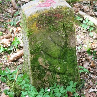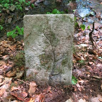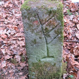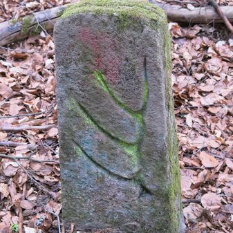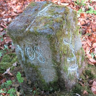 Grenzstein auf Gemarkung Steinenbronn; Dreimärker; Sandstein, rechteckige Grundform, flacher Kopf mit T-förmiger Krinne, Kennzeichnung an den Seiten mit Symbol (Hirschstange) und Nummerierung (108); gut erhalten, 50cm hoch, 29cm breit und 27cm tief.