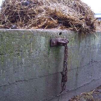 Dunglege, Miste, aus Beton mit Holzgeländer, rechteckig. Wird nicht mehr genutzt. Gut erhalten, 139cm hoch, 298cm breit und 524cm tief.