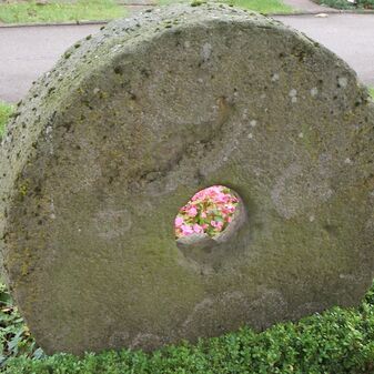 Grabstein für Familie Wolf, Müller in Steinenbronn. Aus Sandstein, Mahlstein und Platte mit Inschrift. Sehr gut erhalten, Durchmesser 1m, 24cm tief.