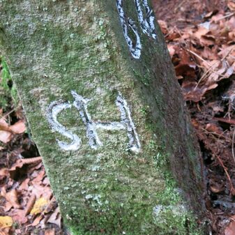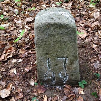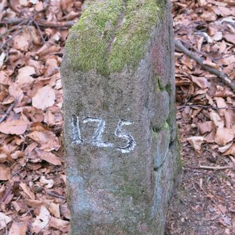 Reihung von 13 Grenzsteinen auf Gemarkung Steinenbronn, Staatswald; beginnend bei Koordinate R: 3510435 / H: 5391914 in südl. Richtung verlaufend. Sandstein, von 1749, rechteckige Grundform, flacher oder leicht gewölbter Kopf; unterschiedlich gut erhalten. Kennzeichnung auf dem Kopf mit gerader, oder geknickter Krinne und an den Seiten z.T. Symbol (Hirschgeweihstange, Wolfsangel), Buchstabe (CST) und Nummerierung (135, 2, 134, 133, 132, 131, 130, 129, $749, 128, 125, 124, 123, 122), z.T. nicht erkennbar.