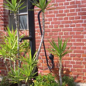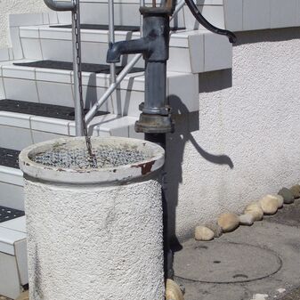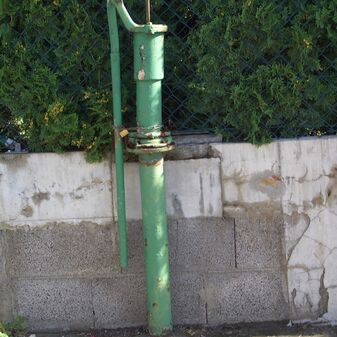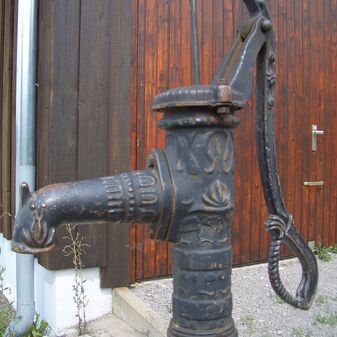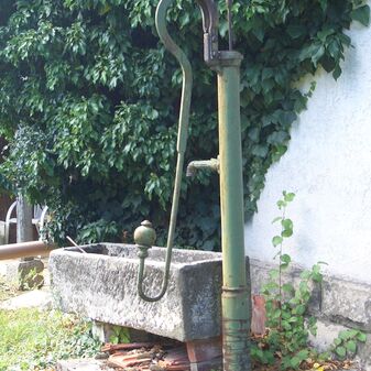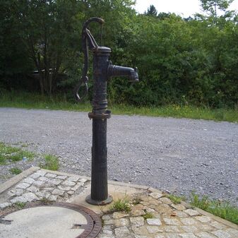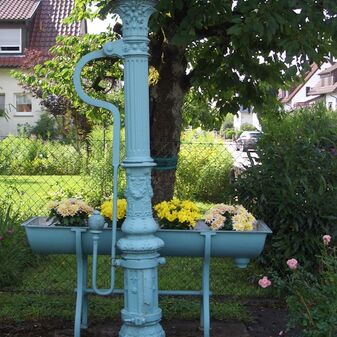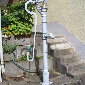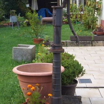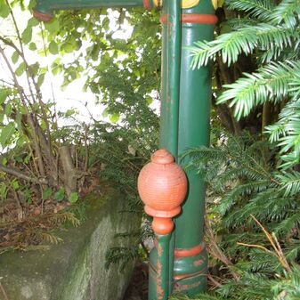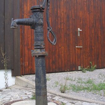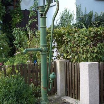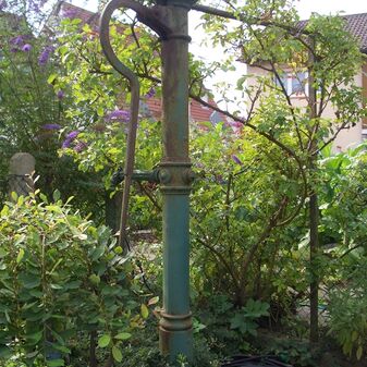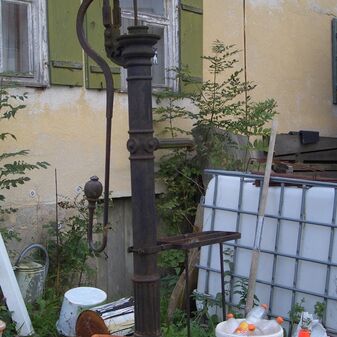 Pumpbrunnen mit gusseisernem Brunnenstock mit Schwengel. Reich verziert, funktionsfähig. Dient den nahe gelegenen Kleingärten zur Bewässerung. Schutzanstrich in schwarzer Farbe. Sehr gut erhalten, 131cm hoch.