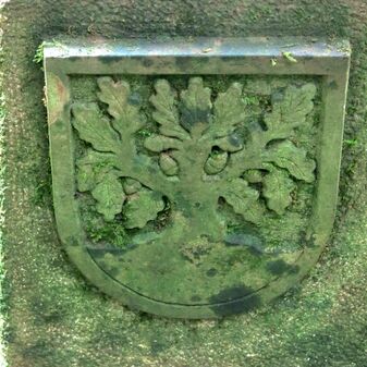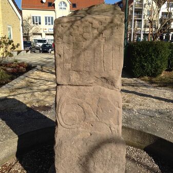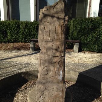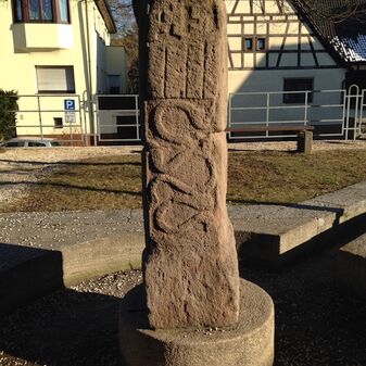 Keltische Stele aus Sandstein mit Rankenmotiv, Replik von 1988. Das Original stammt aus dem 4. Jahrhundert v. Chr.und befindet sich im Landesmuseum in Stuttgart. Metallplatte mit Inschrift. Befriedigend erhalten, 125cm hoch, 42cm breit und 30cm tief.