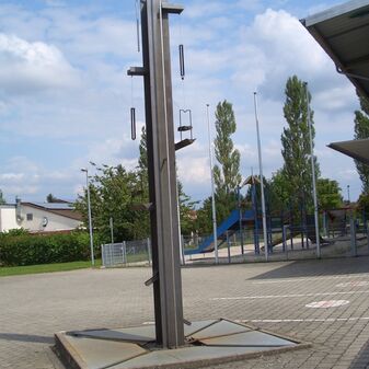 Moderner Laufbrunnen von 1995, mit Wasserspiel aus Stahl, schlanke Stelen, Rinne, Inschrift. Sehr gut erhalten, ca. 5m hoch.