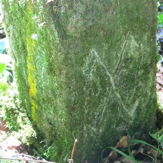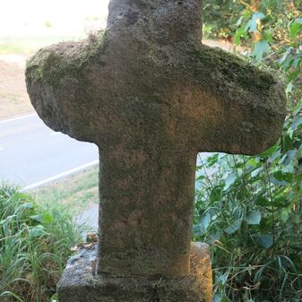 Sühnekreuz aus dem 15. Jahrhundert, Sandstein, auf einem Sockel von 1882 mit Inschrift. Wurde wegen Straßenbaus versetzt. Befriedigend erhalten, 70cm hoch, 58cm breit und 20cm tief.