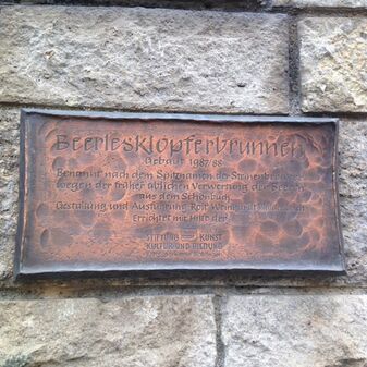 Beerlesklopferbrunnen / Gebaut 1987/88 / Benannt nach dem Spitznamen der Steinenbronner / wegen der früher üblichen Verwertung der Beeren / aus dem Schönbuch. / Gestaltung und Ausführungen Rolf Weinhardt Waldenbuch / Errichtet mit Hilfe der / STIFTUNG KUNST / KULTUR UND BILDUNG / Kreissparkasse Böblingen