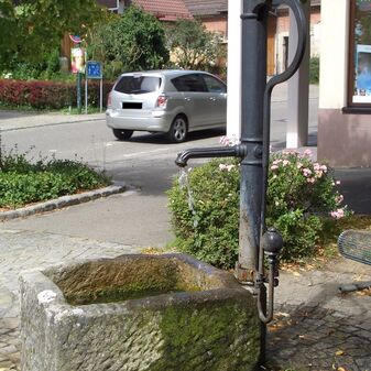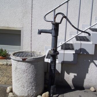Pumpbrunnen mit gusseisernem Brunnenstock, 1999 neu aufgestellt. Gut erhalten, 133cm hoch.
