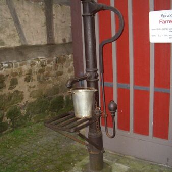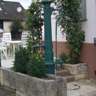 Pumpbrunnen aus dem 19. Jahrhundert; mit gusseisernem Brunnenstock mit Schwengel und rechteckigem Sandsteintrog. Gut erhalten, 205cm hoch, 124cm breit und 45cm tief.