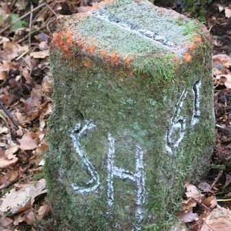 Reihung von 8 Gemarkungsgrenzsteinen auf aktuellem Grenzverlauf Steinenbronn / Schönaich (zugleich Gemeindegrenze Steinenbronn / Schönaich); beginnend bei Koordinate R: 3506676 / H: 5392443 in nördl. Richtung dem Grenzverlauf folgend. Sandstein oder Granit, rechteckige Grundform, flacher oder leicht gewölbter Kopf; unterschiedlich gut erhalten. Kennzeichnung auf dem Kopf mit gerader oder geknickter Krinne und an den Seiten z.T. Symbol (Hirschgeweihstange), Buchstabe (SH, CSch, S) und Nummerierung (60, 61, 62, $749, 63, 64, 65, 66, 67, 72, $749), z.T. nicht erkennbar, von 1749, z.T. neu gesetzt.